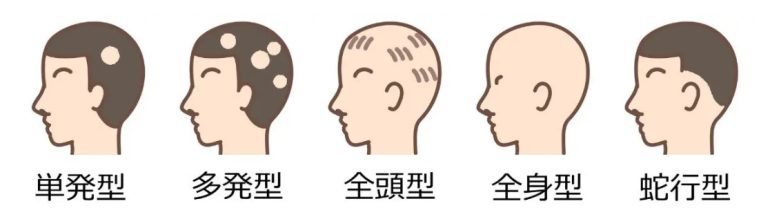 頭髪だけでなく、眉毛・まつ毛・ヒゲ・体毛など全身の毛が抜ける最重症タイプです。治療期間は全頭型と同様に長期に及ぶことが多く、慎重な管理が求められます。