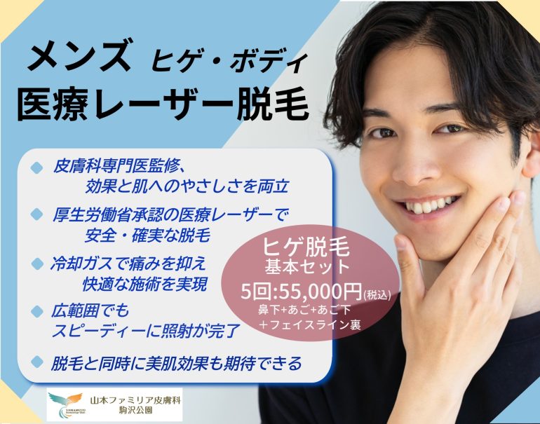 山本ファミリア皮膚科 駒沢公園では、皮膚科専門医が監修する安全・確実な医療脱毛で、男性の肌質や毛質に合わせた医療レーザー脱毛を提供しています。