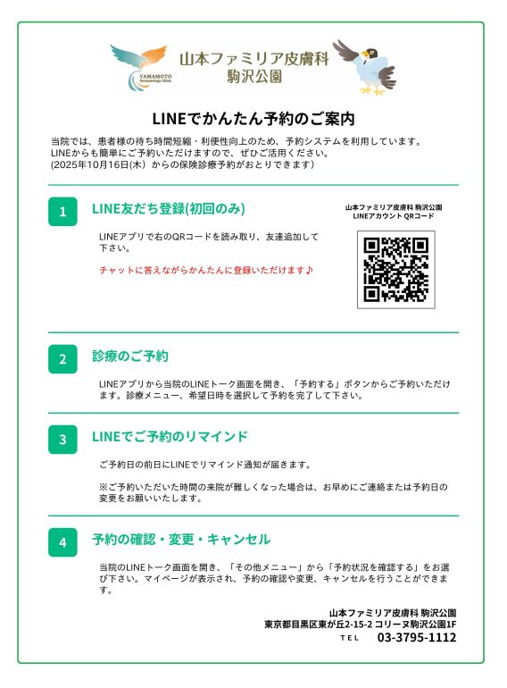 この度、患者様の利便性向上のため、「保険診療」は2025年10月16日(木)ご予約分より、「美容皮膚科(美容施術)」は11月6日(木)ご予約分より(予定)、新しいインターネット予約システムへ変更させていただくこととなりました。