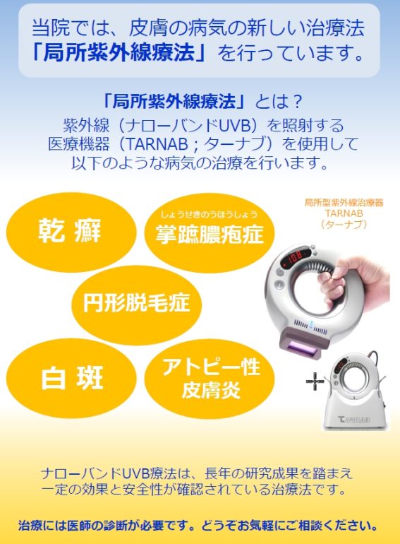 紫外線治療(保険適用)「ターゲット型ナローバンドUVB(ターナブ)」導入のお知らせ